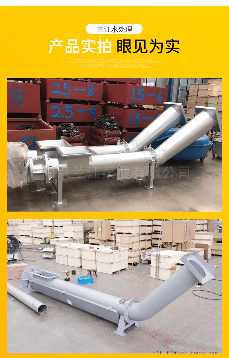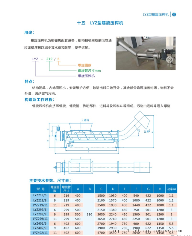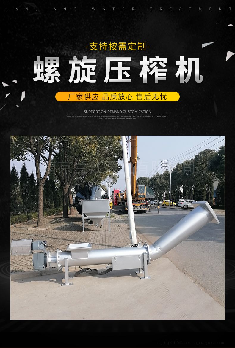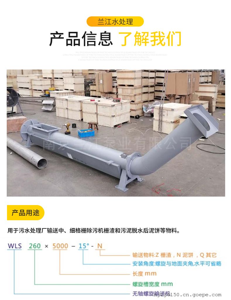 构造及输送过程:WLSY型无轴螺旋输送压实一体机由驱动装置、无轴螺旋、U型槽、支架、衬板、盖板、进料口、挤压段、出料口和排水管组成。物料由进料口输入,在螺旋推动下栅渣前移到挤压段脱水后从出料口排出,挤压出的水流经排水管并引入栅渠中。