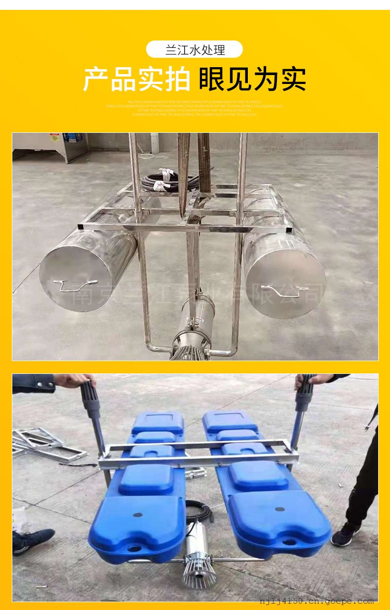 推流式曝气机由主机、固定支架、进气管及推流曝气叶轮四部分组成。曝气叶轮把极微小的气泡吹入水底,有效地循环增氧,广泛应用于小型景观水治理领域,有效的减少基础投资,运行管理方便。南京兰江推流曝气机有以下特点:采用潜水式电机*运转,对环境影响小;具有曝气、混合、推流等多重作用;主体采用不锈钢和高强度工程塑料,耐酸、碱及部分有机溶剂腐蚀;具有阴极保护块,适用范围更广泛;安装喷射角可在上下60°范围内调整;安装水深可自由调节,适合不同深度水体;设备多级组合使用,使水体富氧鲜活,流水不腐。
