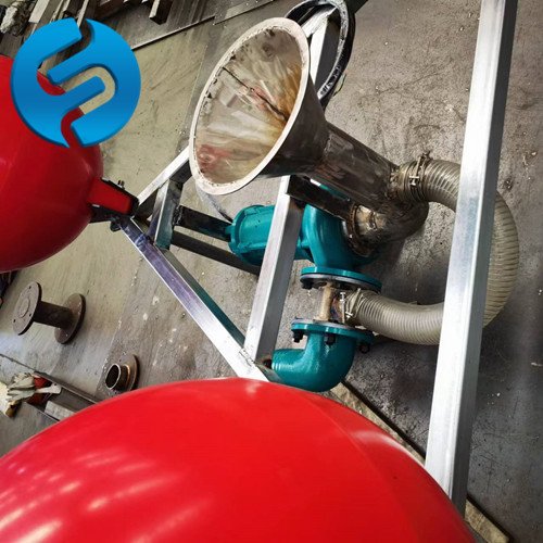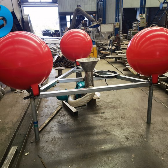 该机安装使用方便,可根据实际需要,确定设备工作时间和安装位置。使用时将吸沫机放置在浮泥集聚的区域,用三根绳分别拴在三个浮筒的绳环上,将三根绳索分三个方向牵引并固定即可。