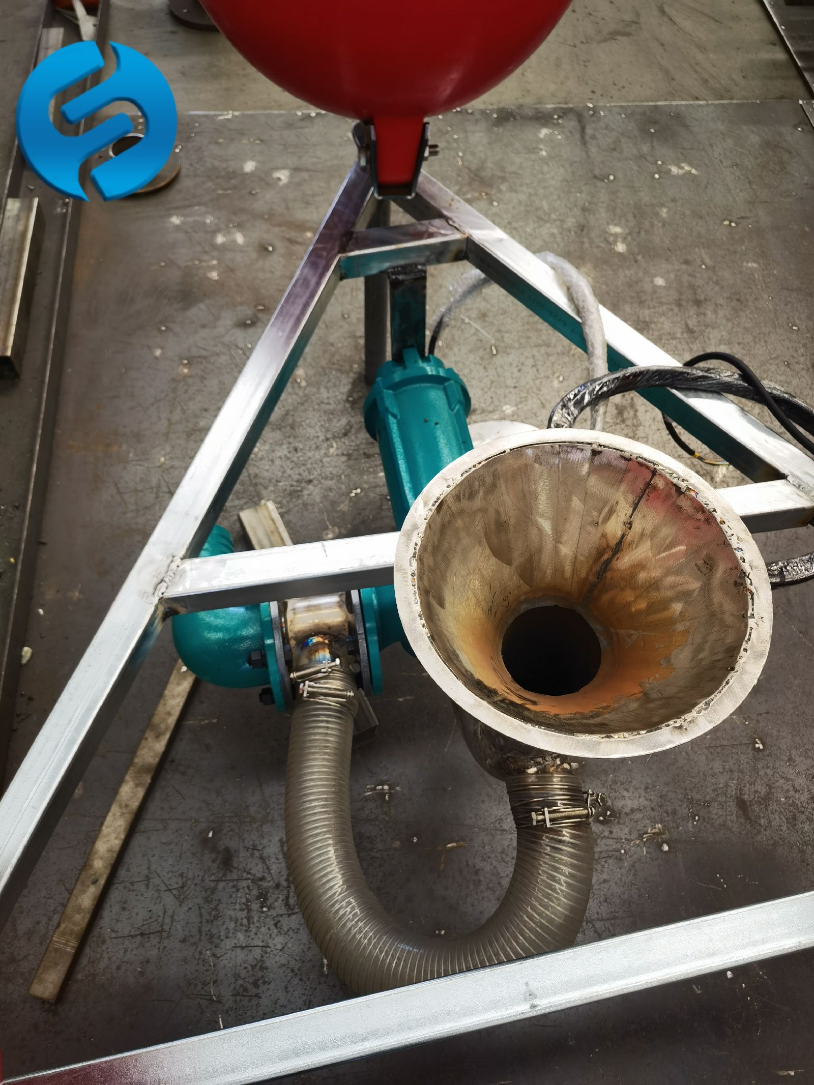 该机安装使用方便,可根据实际需要,确定设备工作时间和安装位置。使用时将吸沫机放置在浮泥集聚的区域,用三根绳分别拴在三个浮筒的绳环上,将三根绳索分三个方向牵引并固定即可。